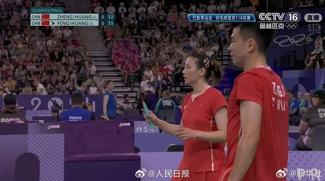 在巴黎奥运会羽毛球混双1/4决赛中,中国队郑思维/黄雅琼战胜队友冯彦哲/黄东萍 ,晋级四强。