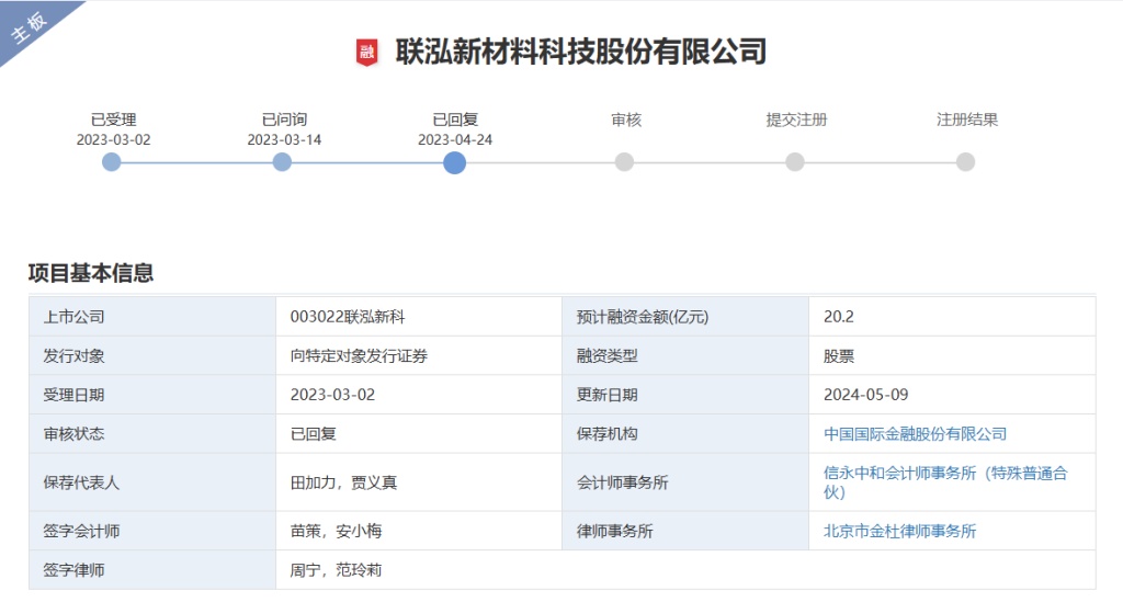 对于定增项目的相关情况,联泓新科在接受风口财经采访时表示,目前项目还在审核状态,具体进展还要等待交易所下一步的审核安排。