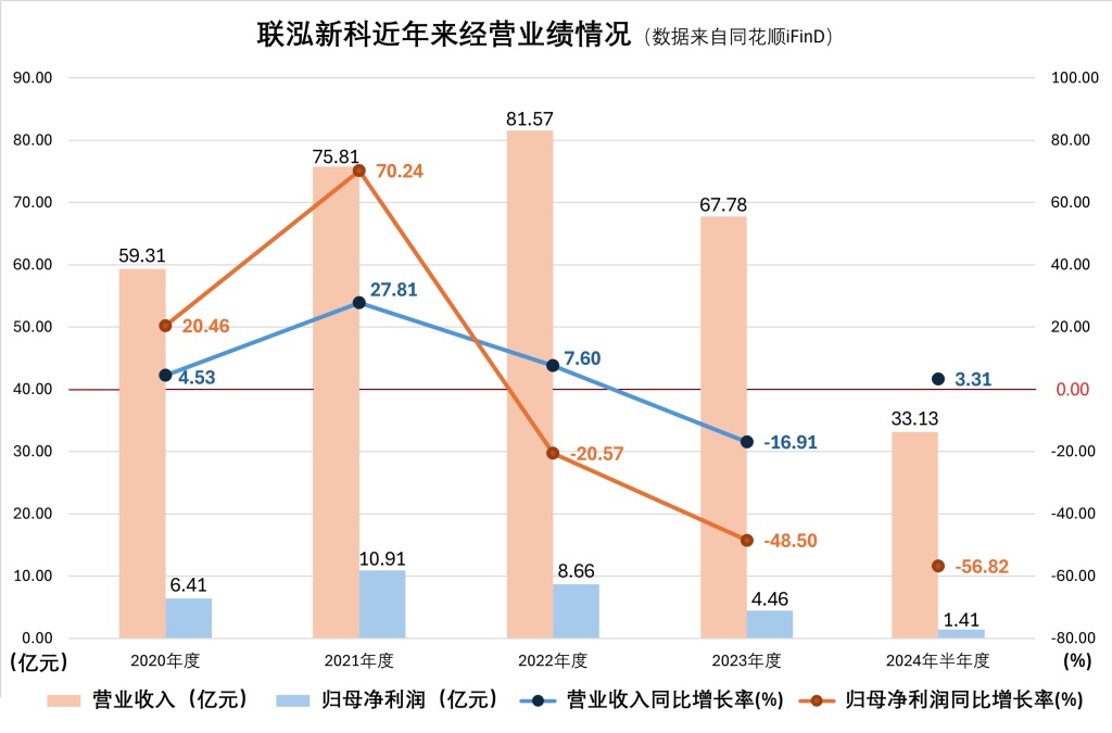 近期,联泓新材料科技股份有限公司(以下简称“联泓新科”)披露了2024年半年报,公司“增收不增利”,归母净利润同比大幅下降56.82%。值得注意的是,自2022年以来,联泓新科的利润一直在下降。