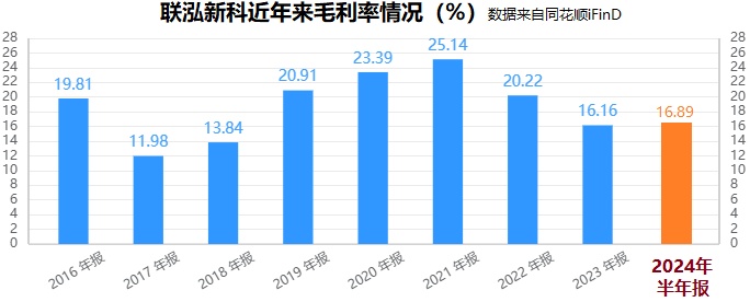 同花顺iFinD数据显示,2024年上半年公司的毛利率只有16.89%。虽然较上年同期微涨,但与过往相比有不小的差距。