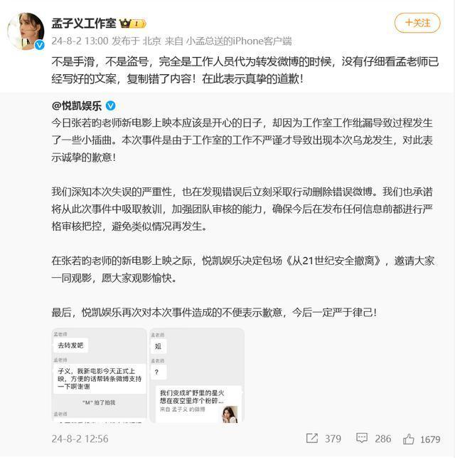 随后,孟子义工作室转发悦凯娱乐的道歉文回应:“不是手滑,不是盗号,完全是工作人员代为转发微博的时候,没有仔细看孟老师已经写好的文案,复制错了内容!在此表示真挚的道歉!”