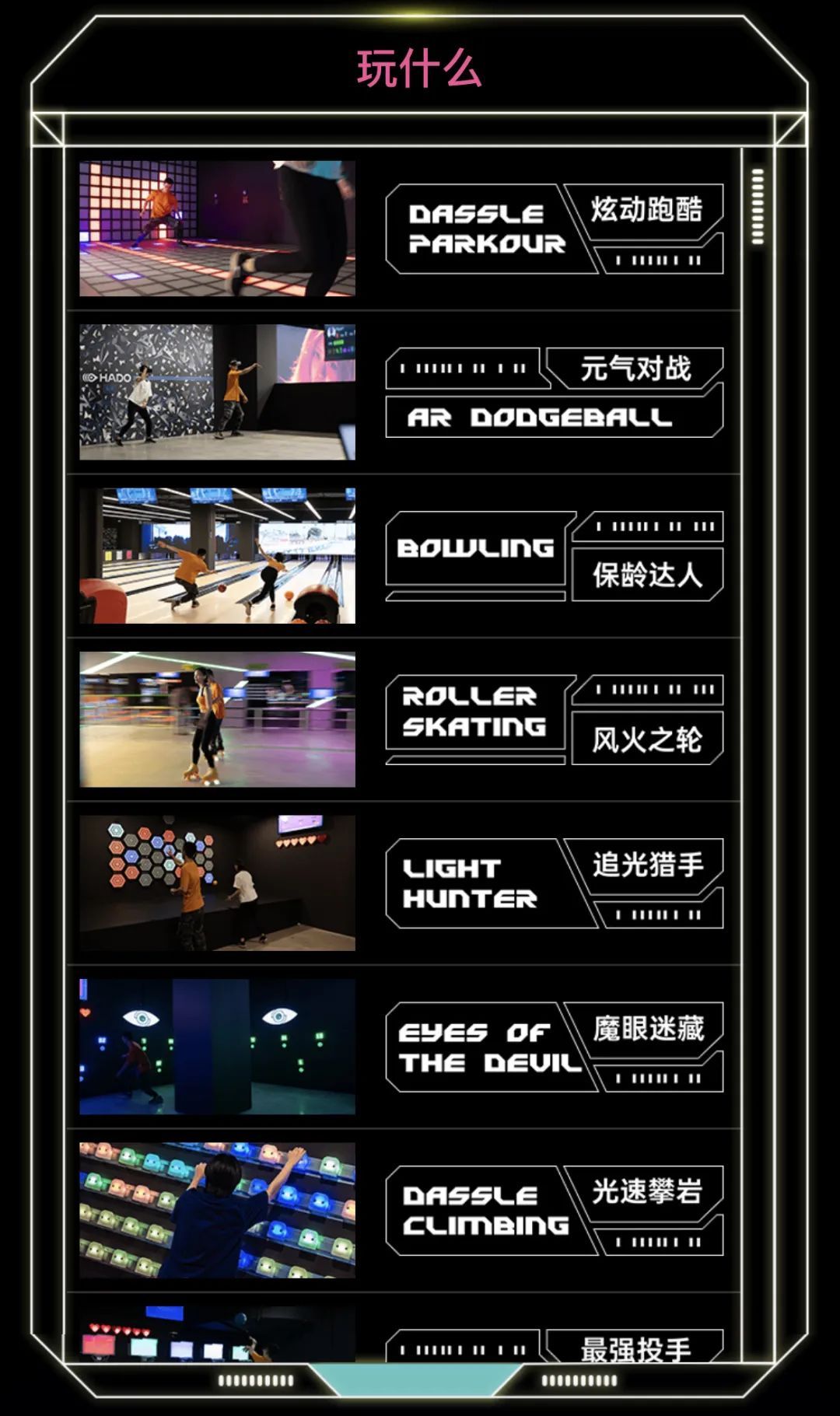 在这里,不仅能体验保龄球、桌球、轮滑、壁球等热门运动项目,还有佩戴AR眼镜的虚拟躲避球、炫动跑酷、光速攀岩、追光猎手、魔眼迷藏等采用最新科技的赛博运动项目等你来玩!