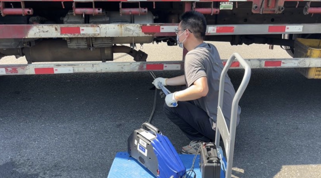 此时地面温度已经达40多度,每次对车辆进行检查,工作人员都要蹲在地上,将采样仪器伸入排气管。