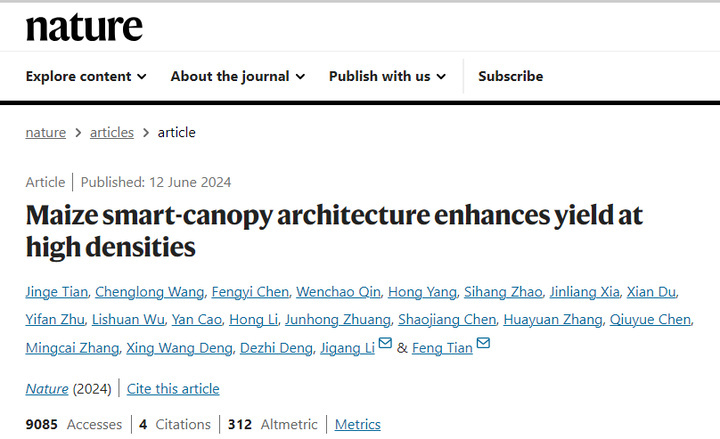 ▲《自然》杂志在线发表重磅文章《智慧冠层促进玉米密植增产》。