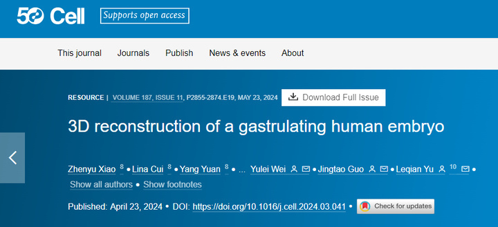《细胞》期刊官网发布《3D构建人类早期胚胎发育原肠胚模型》这一成果。