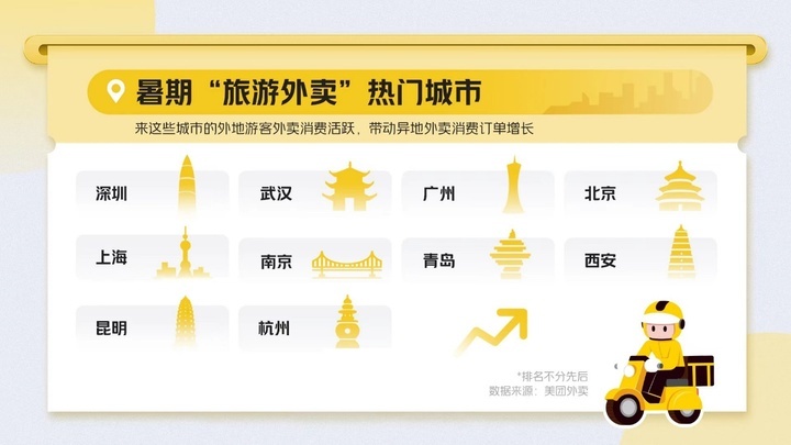 时下进入暑期旅游旺季,从往年的“特种兵式旅游”,到今年的“City不City”的情绪价值体验,旅游的关键词不断变化,但目的地城市的特色美食清单,始终是旅游体验中的必选题。全国热门旅游目的地,除了升腾的线下烟火气,“旅游迁徙”也激活线上消费。在热门旅游目的地城市,外地游客的外卖订单也随之增长。美团外卖数据显示,7月以来,因为外地游客的涌入,外卖“异地订单”消费热门城市,包括深圳、杭州、武汉、广州、北京、上海、南京、青岛、西安、昆明等地。线下打卡品尝特色餐馆,线上点外卖解锁更多当地特色美食,成为年轻人“美食之旅”的标配方式。