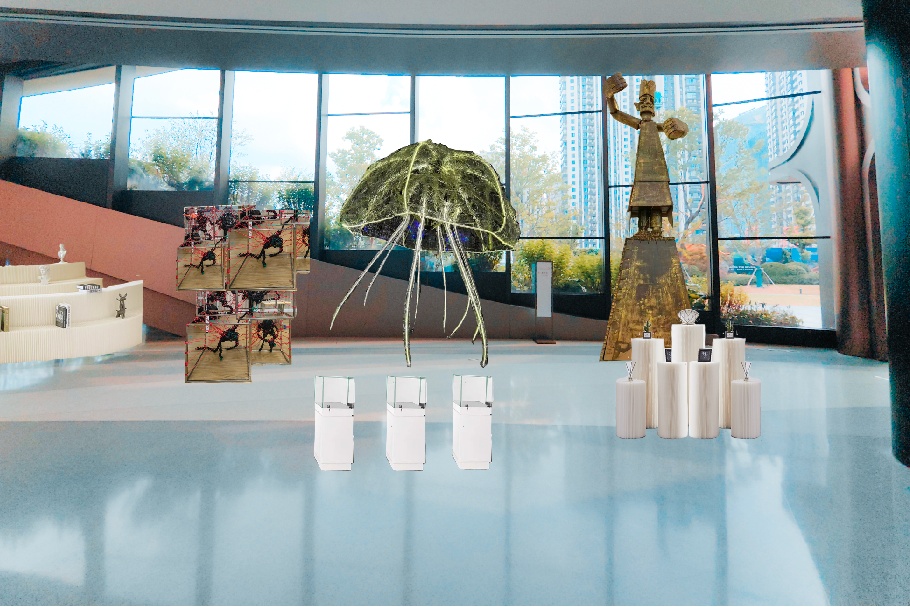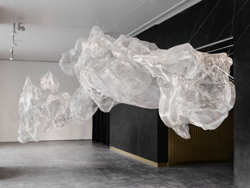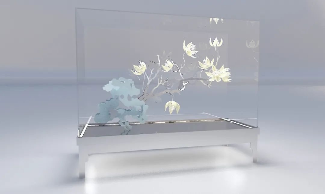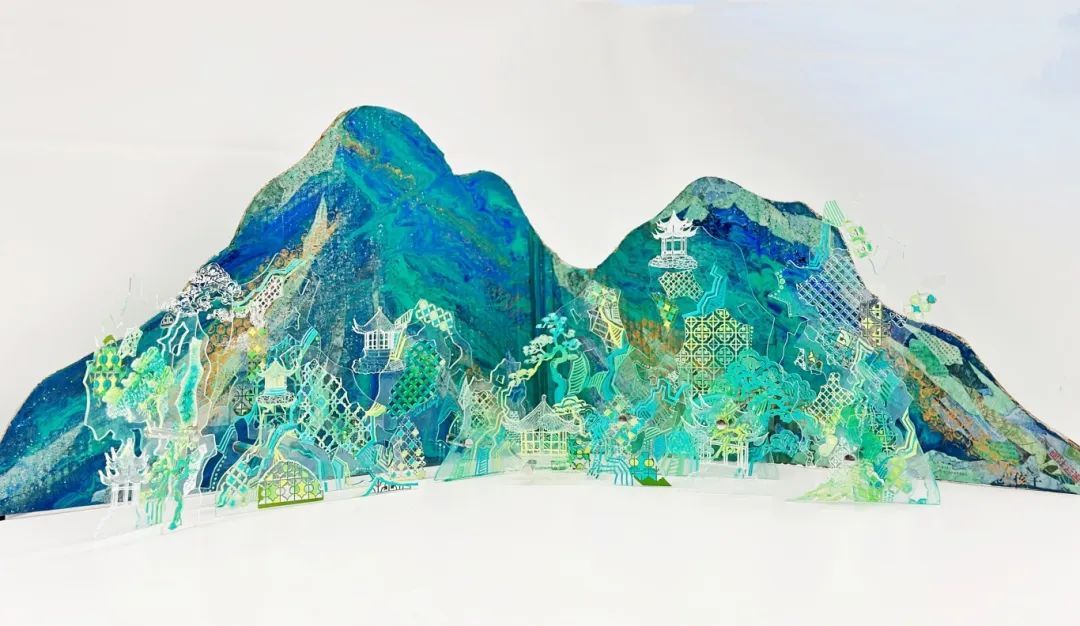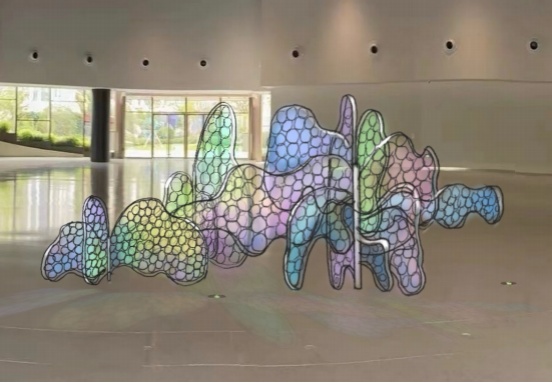 以中国传统意蕴,结合现代材料、当代手法和未来科技,创造出未来与传统结合、兼具文人风骨与时代精神的艺术装置。不锈钢、亚克力、织物纤维、机械交织,却又以宋画为底,让整个装置呈现出别开生面的中国文人山水意境。 千境繁花 《彩虹树》灵感源自朝霞七彩的云朵和彩虹,这些自然现象在特定时刻呈现出流光溢彩的美丽景象。通过塑料透明的特性,作品让不同的色彩在观众的视线中交错变化。随着观众在作品周围移动,色彩和形态不断交叠、变化、仿佛彩云般流动,呈现出一种动态的美感。 彩虹树 岁月成歌,树木以独特的方式谱写它的生命之歌。以年轮为记,我们一起阅读树大生长的印记,一起听见向上生长的声音。借由AI技术,作品将树木的年轮图案转化为音乐和诗歌,当观众选择不同的年轮切片,机器视觉将读取不同年轮的纹理产生音乐,并与视觉影像呼应,构成“生”的殿堂。 木 如同古人从自然取石,叠石造景,在这座人类世的花园里,艺术家选用了不锈钢纤维表现山石。从材料上,这种金属原材料来自于山脉和地矿,既是现代工业文明精心改造的产物,又源于自然本体,更是对社会和自然双重属性极好的隐喻。同时,纤维本身的通透感,带来了在空间中无限的变化,多层网之间的层叠效果,很好地呈现了中国传统山水画的意蕴和层次感,浑厚轻盈却又富于变化。 山脉