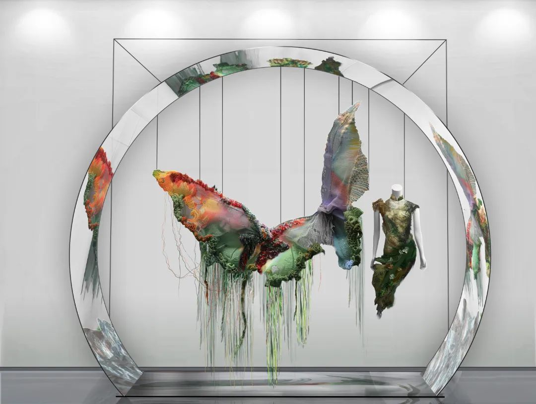 设计师以蝴蝶作为灵感主体,用作环境保护宣传的媒介,增加公众对环境保护重要性的认识。将非遗海派钩针元素、环保植物染色技艺结合当代艺术表现形式,打造了一组震撼人心的海派钩针艺术作品,其中包括高定服装艺术作品《WJX·蝶梦》、大型手工装置艺术作品《海上青绿·蝶之境》,呼应大自然中生命的壮丽与海派文化传承的魅力,在展现蝴蝶在绿野中自由飞舞的同时,点缀非遗海派技艺。