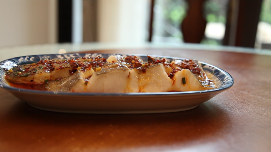 7.用老干妈、葱、水等炒辣酱汁,淋至鸦片鱼上即可享用。