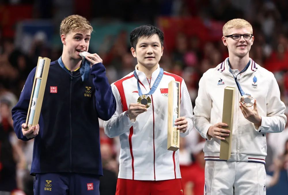 8月4日,冠军中国选手樊振东(中)、亚军瑞典选手莫雷高德(左)、季军法国选手菲利克斯·勒布伦在颁奖仪式上。当日,在巴黎奥运会乒乓球男单决赛中,中国选手樊振东4比1战胜瑞典选手莫雷高德,夺得金牌。新华社记者 王东震 摄