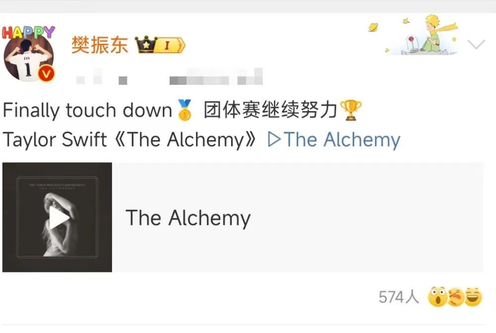 除了足球,樊振东还喜欢音乐,尤其是美国明星泰勒·斯威夫特。他曾自拍过看“霉霉”演唱会的vlog,并跟唱歌曲《残夏》。