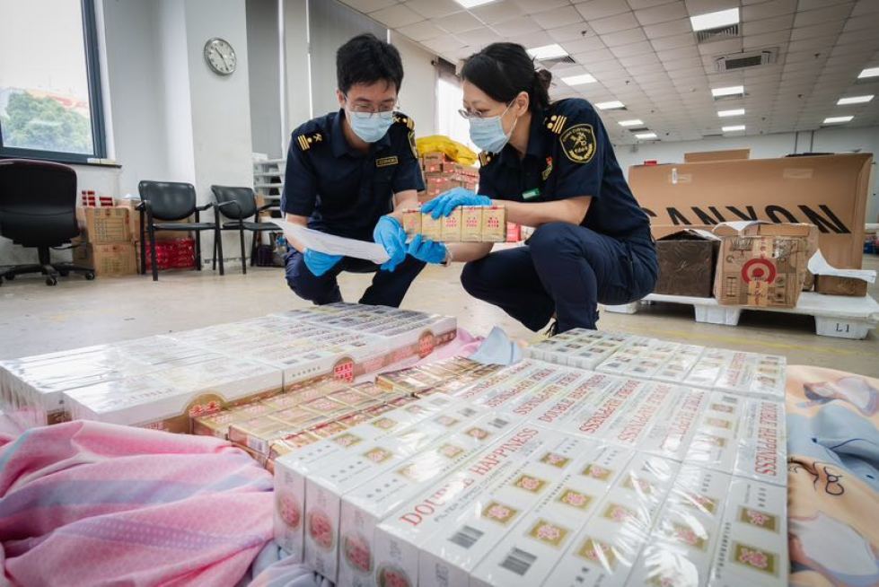 近日,上海海关所属上海浦东国际机场海关关员对一票申报品名为“被套”的出口快件进行查验时,发现其体积重量异常,疑似存在夹藏。开箱彻查后发现,被套内包裹“红双喜”品牌香烟60条,共12000支。