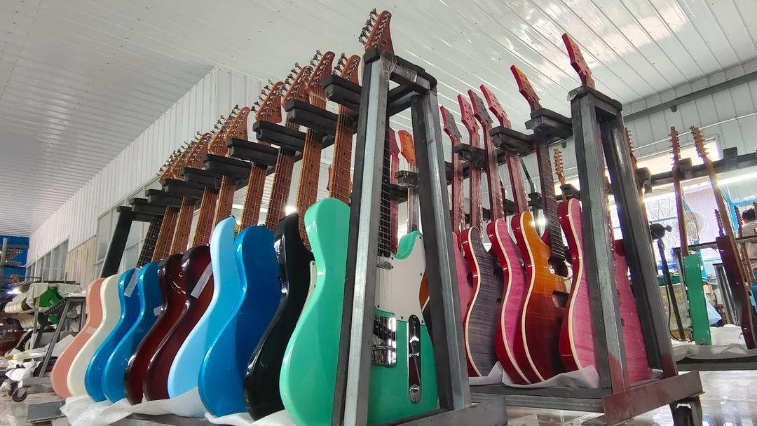 乡镇的工厂里,断断续续传出电吉他的弹奏音,迈进工厂车间,木材烘干、拼板、打磨、抛光、调音……历经大大小小40多道工序,在这里,你可以看见一把电吉他从无到有。这里,是山东潍坊昌乐的鄌郚镇。