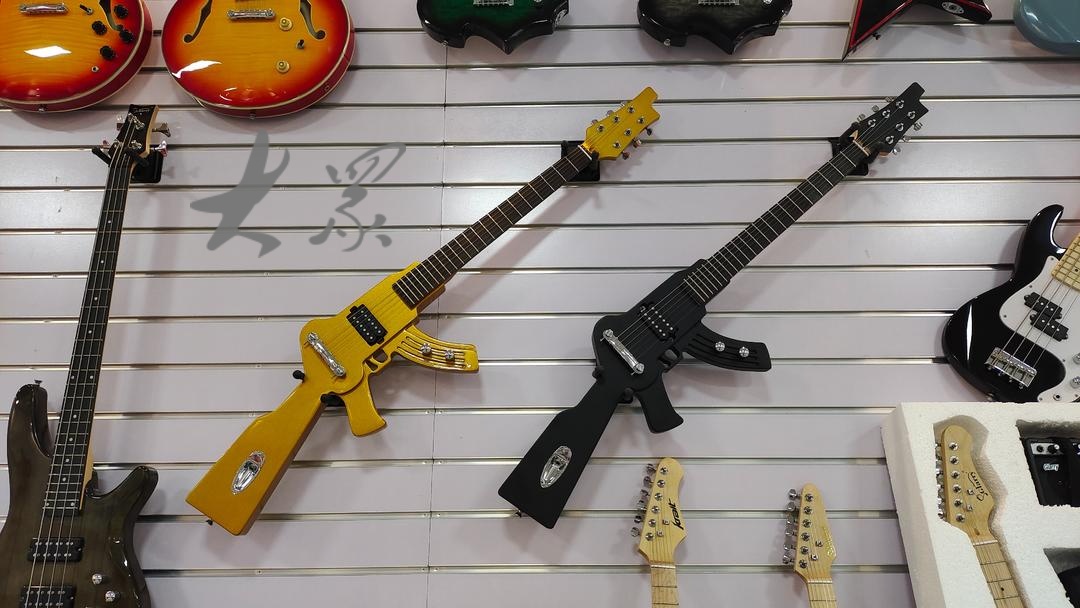 鄌郚镇昌韵达乐器厂展览馆的两把电吉他造型独特。都亚男摄