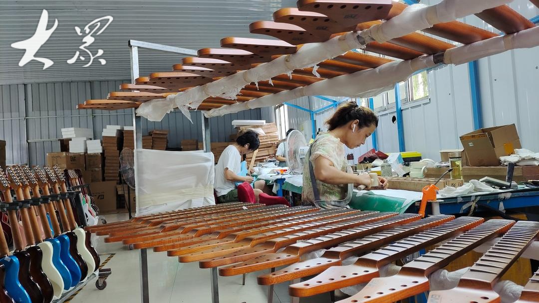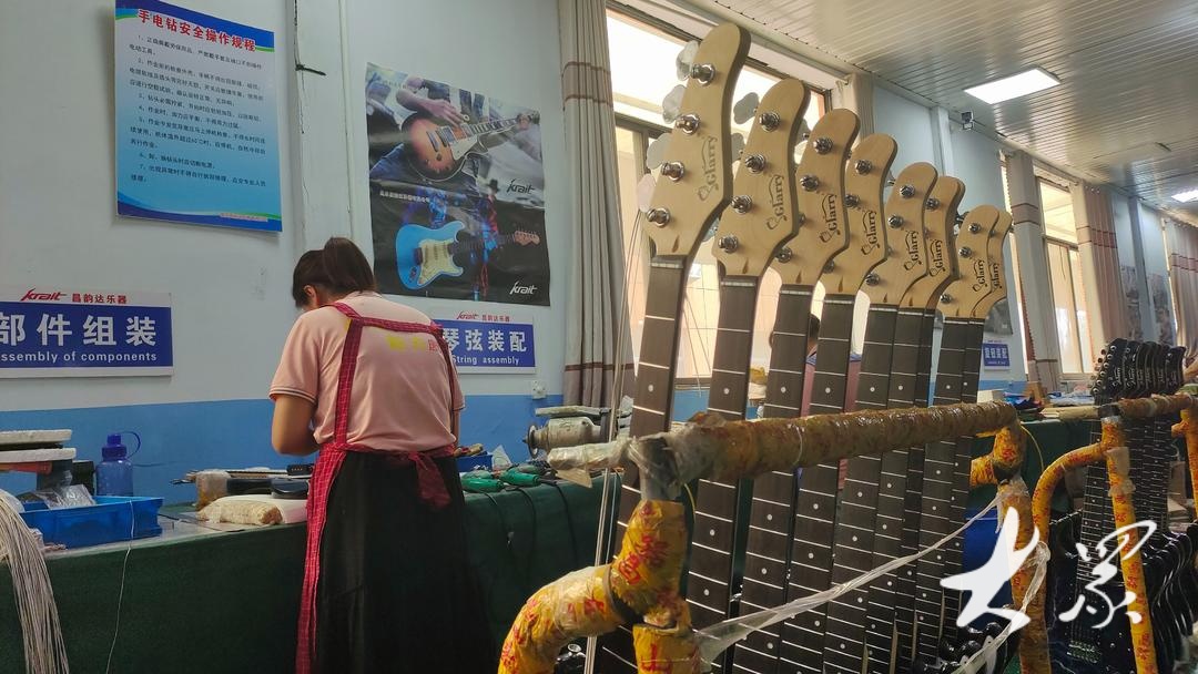 昌韵达是鄌郚镇规模最大的吉他企业,去年,年营收超6000万元,年产约15万把吉他,张建军说,“截至目前,今年已经干了10万多把,现在又接到手的订单是5万多把,预计今年全年订单量将超20万把。”