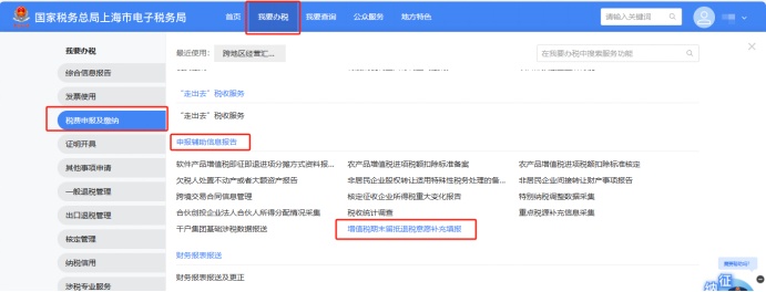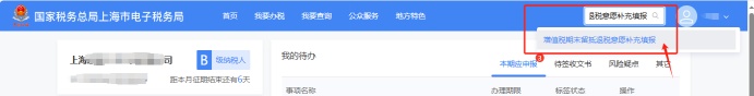 登录新电子税局后,依次点击【我要办税】-【税费申报及缴纳】-【申报辅助信息报告】-【增值税期末留抵退税意愿补充填报】,或首页搜索栏输入关键字查找“增值税期末留抵退税意愿补充填报”,进入相关功能页面。