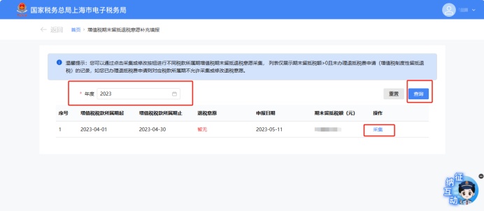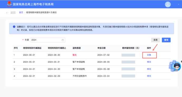 若您存在未采集退税意愿的属期,您可点击操作列的【采集】按钮,进入采集页面补充采集。
