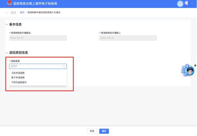 采集页面默认填充对应增值税税款所属期起止时间,您可根据实际情况选择对应的退税意愿。