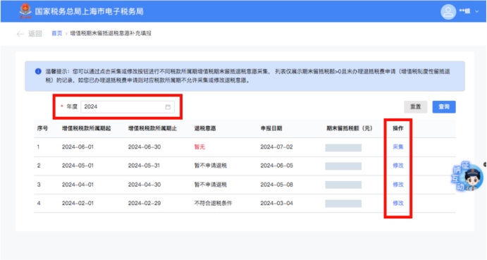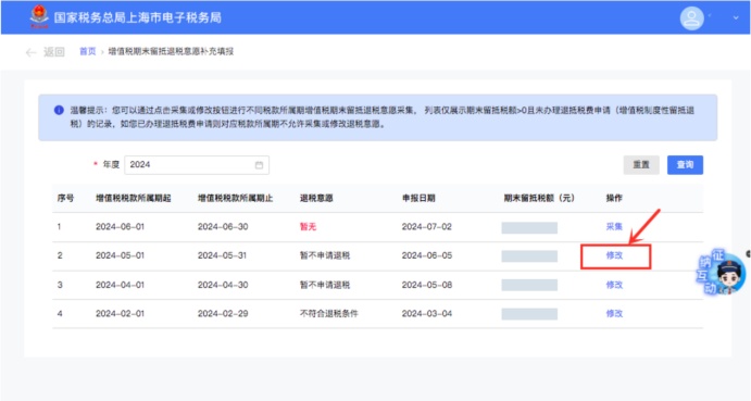 修改已经采集的退税意愿