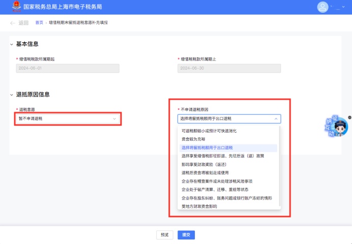 若您的退税意愿选择“暂不申请退税”,需要选择不申请退税原因。
