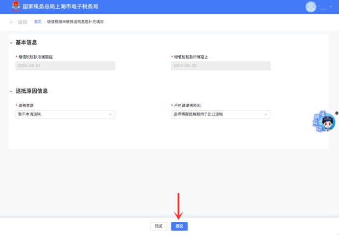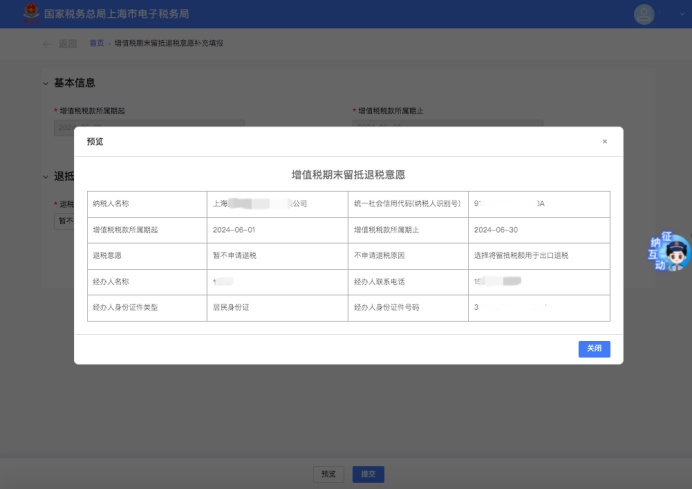确认信息无误后,点击【提交】按钮,提交保存采集或修改的退税意愿,完成意愿采集流程。