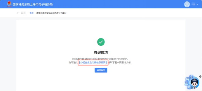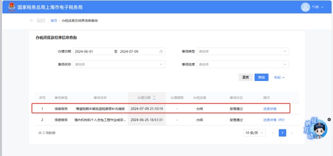 您可以点击【办税进度及结果查询】进入查询界面,查看该事项的办税进度和状态。