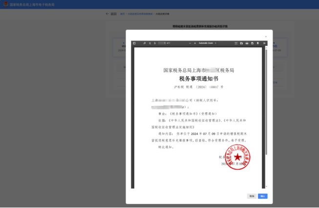 点击“进度详情”可下载文书,您可自行下载打印带章的《税务事项通知书》。
