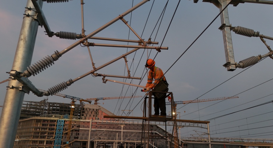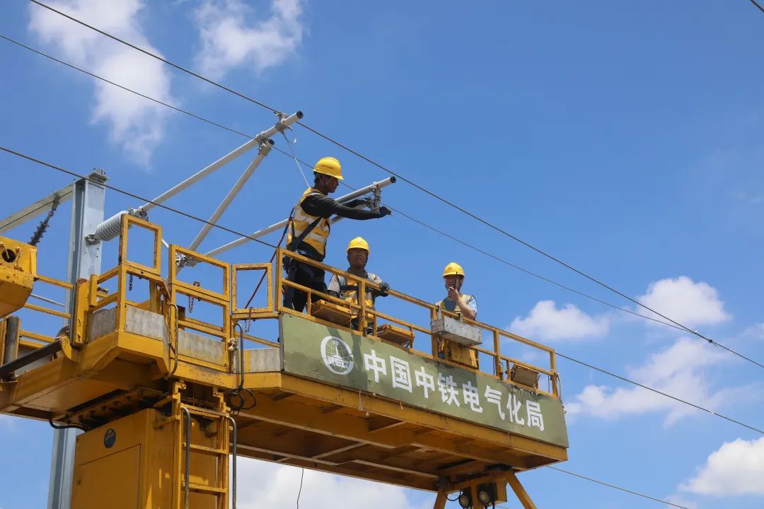 杭州供电段技术人员对苏州南站接触网设备进行检查(摄影:甘长巍)