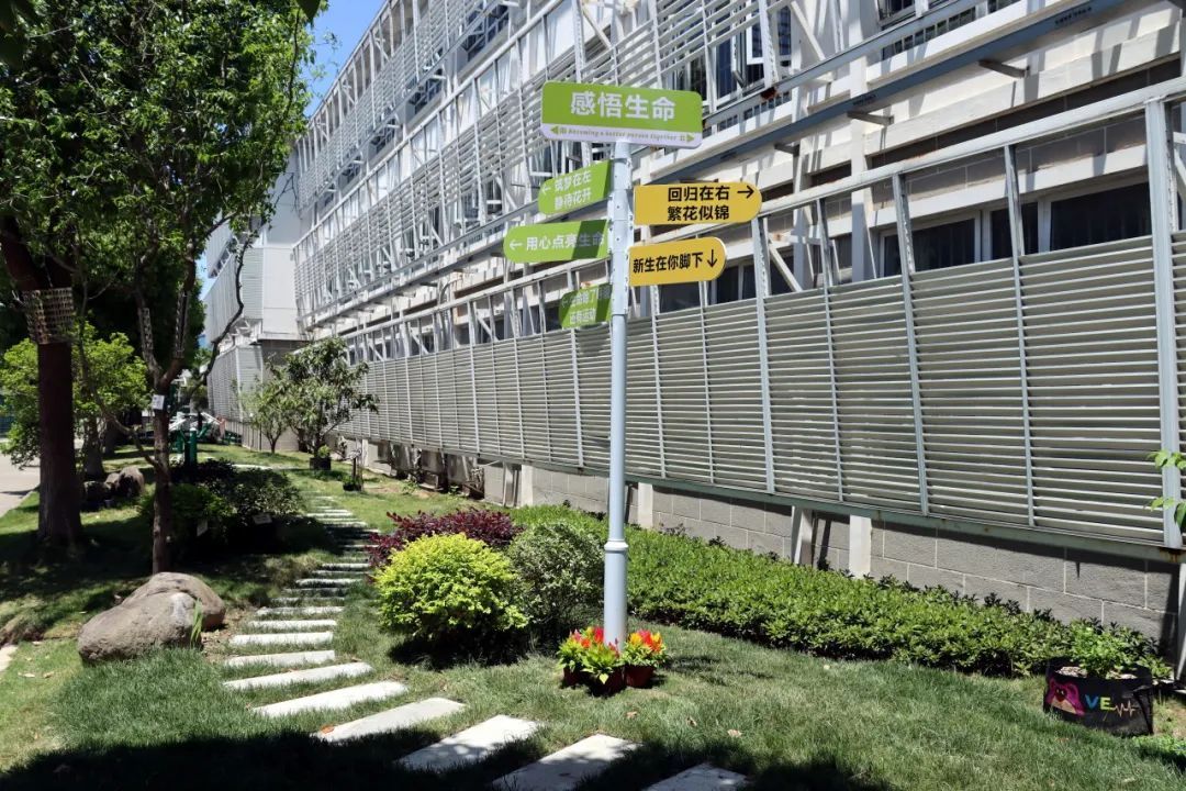 在“心田花园”的中央,树立着一个象征“灯塔”的路牌,它寓意指引罪犯找寻生命的意义和人生的方向。路牌顶部的主牌上书写着—“感悟生命”,这四个字深刻揭示监狱生命教育文化的内涵。