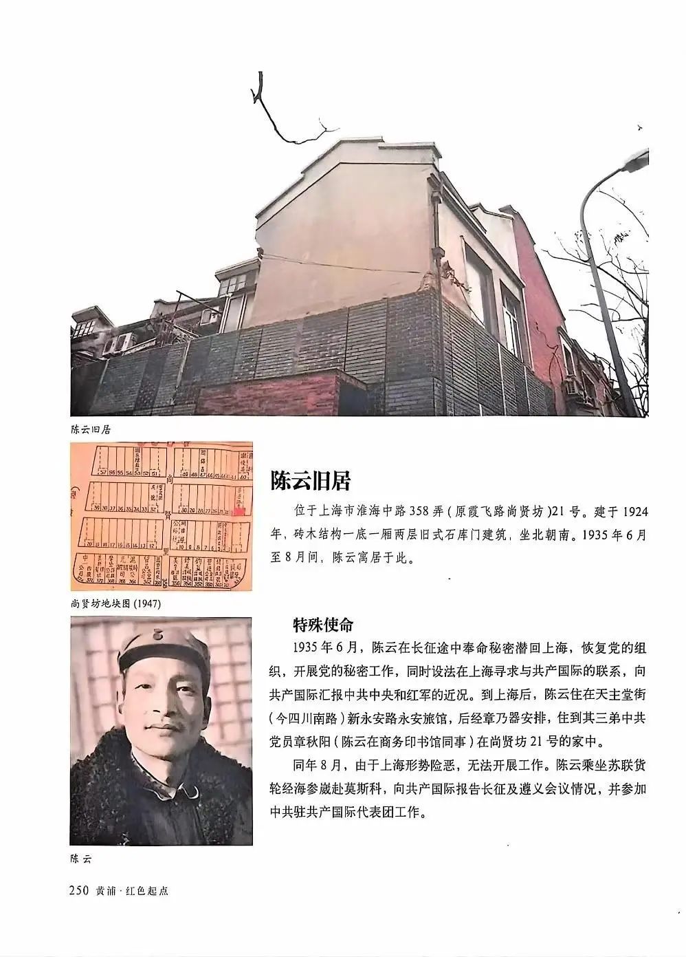 这比单纯留在长征队伍中更加困难。但强者从来不会抱怨环境。陈云历经千辛万苦地回到了上海,先落脚在天主堂街(现在的四川南路)新永安路永安旅馆。后来寄住在尚贤坊21号党员章秋阳家中。