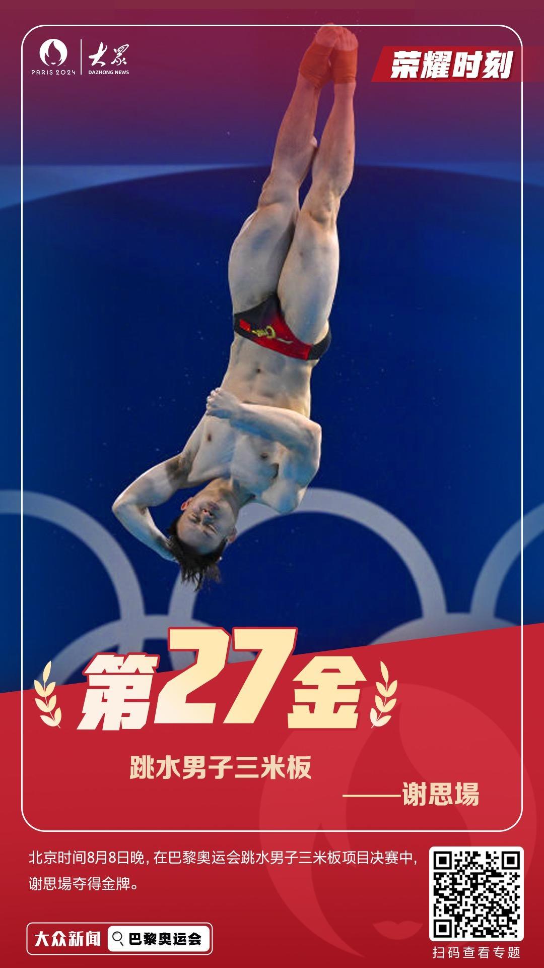 北京时间8月8日晚,在巴黎奥运会跳水男子三米板项目决赛中,中国选手谢思埸拿下金牌!帮助中国跳水队实现该项目三连冠,王宗源获得银牌。这是中国代表团在本届奥运会获得的第27枚金牌,也是中国跳水队在本届奥运会上的第六枚金牌。祝贺!详情>>