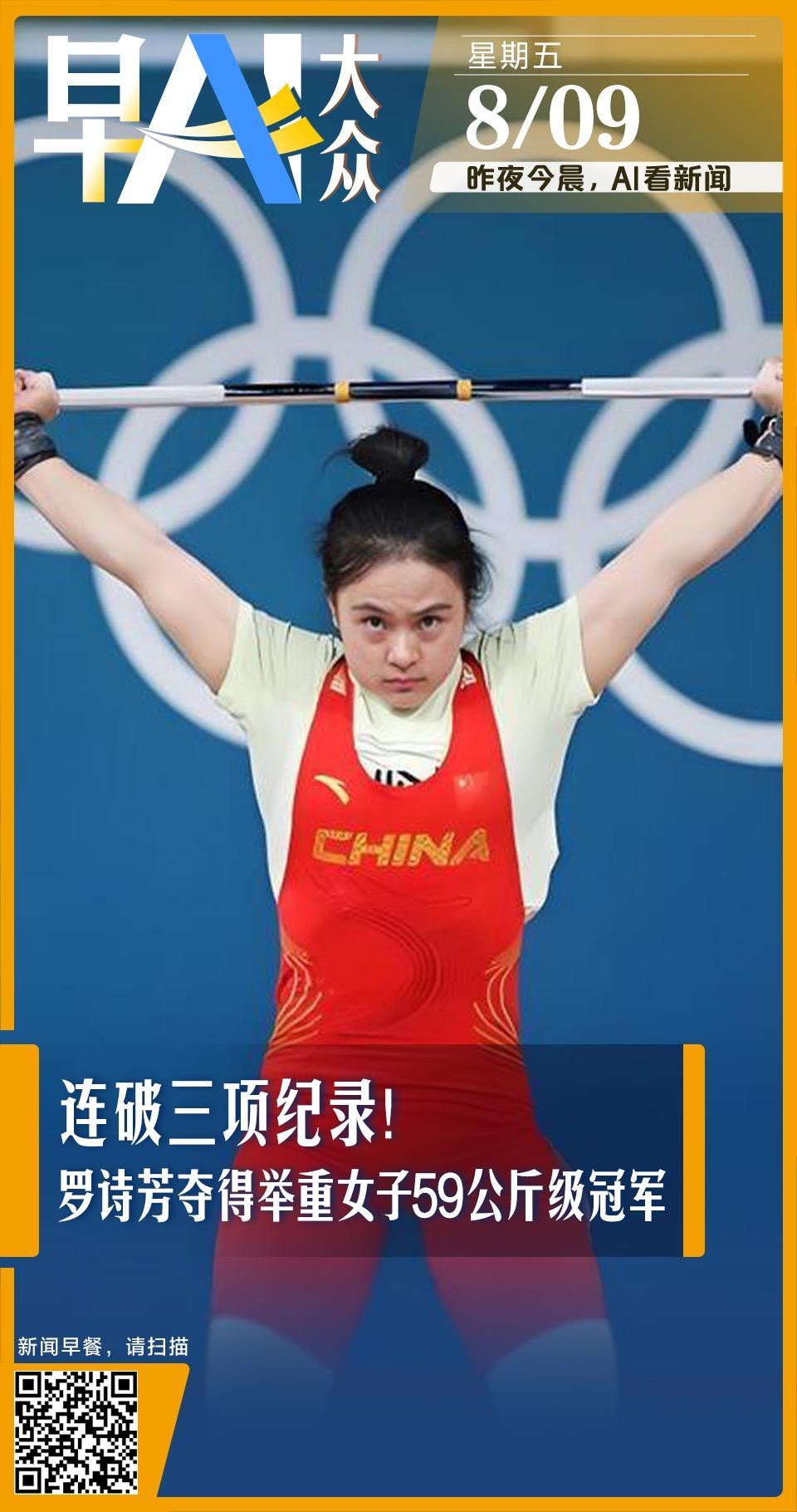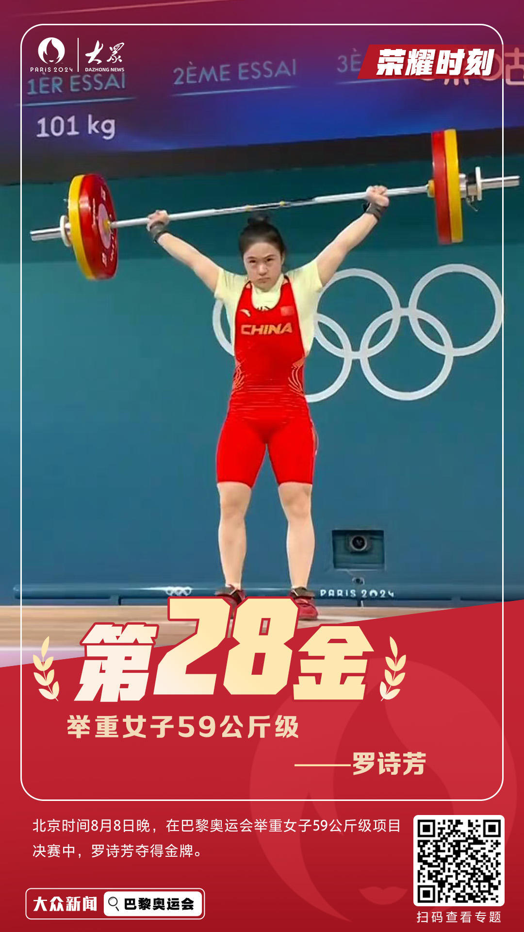 北京时间8月8日,在巴黎奥运会举重女子59公斤级比赛中,中国选手罗诗芳夺得金牌。这是中国代表团在本届奥运会获得的第28枚金牌。
