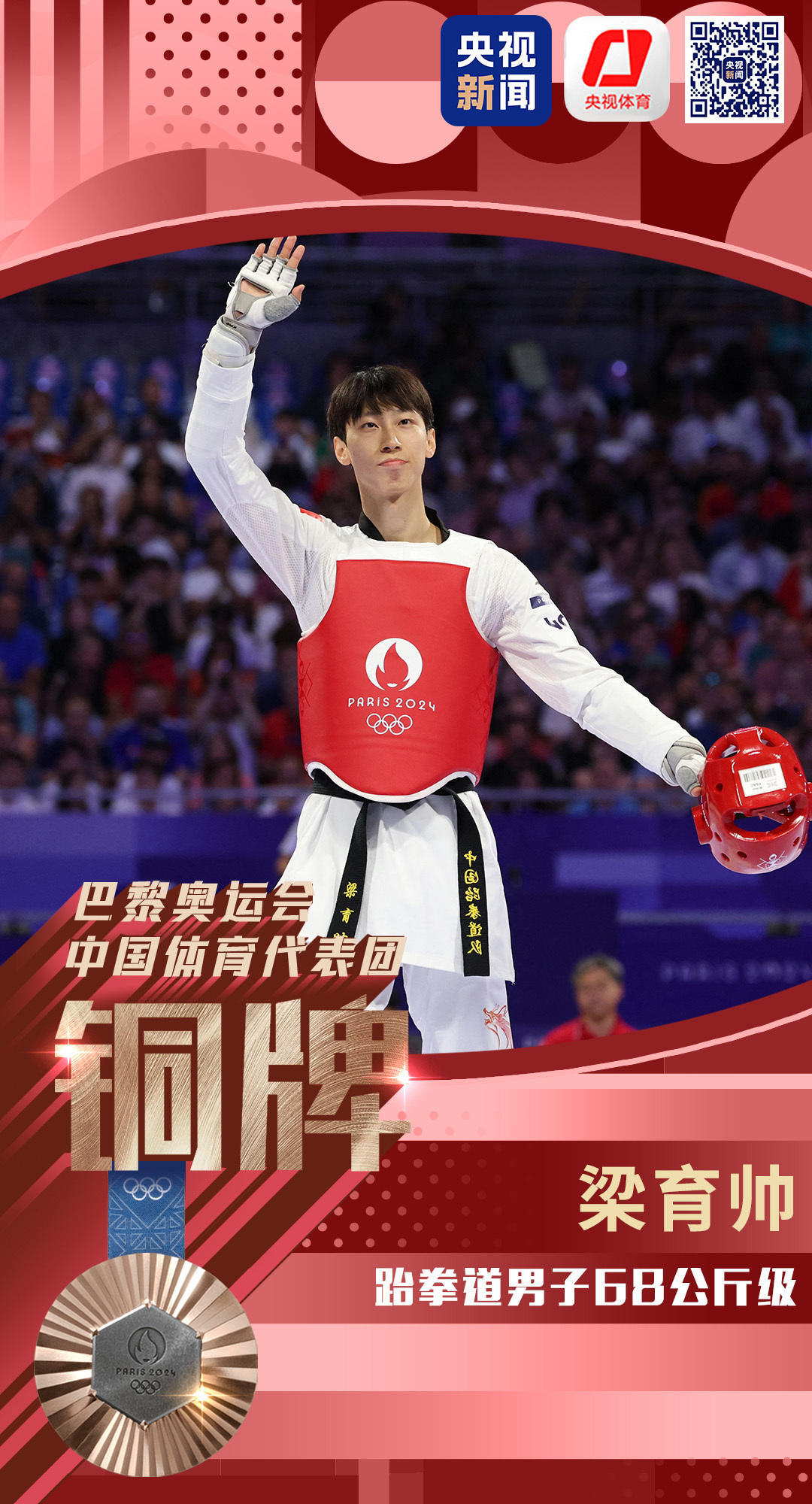 梁育帅夺得跆拳道男子68公斤级铜牌