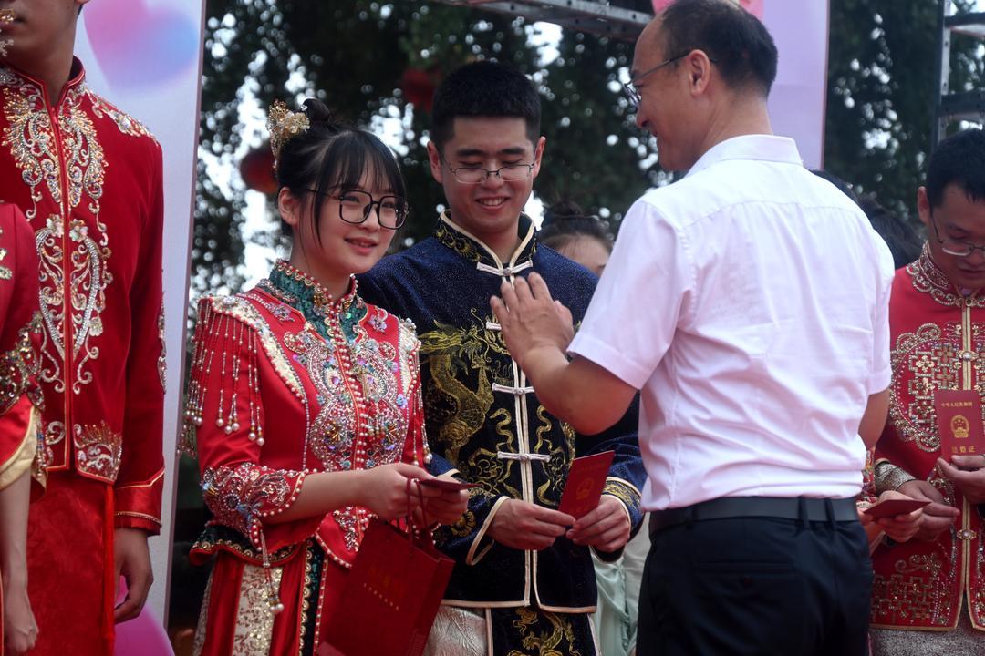 8月9日上午,在荣成市石岛管理区宁津街道渠隔村的千年银杏树下,结婚登记的10对情侣携手许下一生的幸福承诺,威海和荣成市相关领导为新人颁发结婚证书。