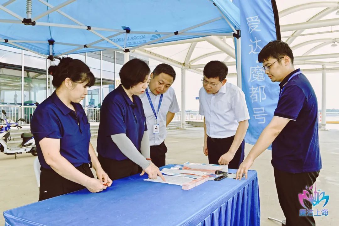 宝山区纪检监察干部冒着高温酷暑,在吴淞口国际邮轮码头监督检查邮轮过境服务保障工作,查看“爱达·魔都号”进港相关台账资料。(宝山区纪委监委供 王晓云 摄)
