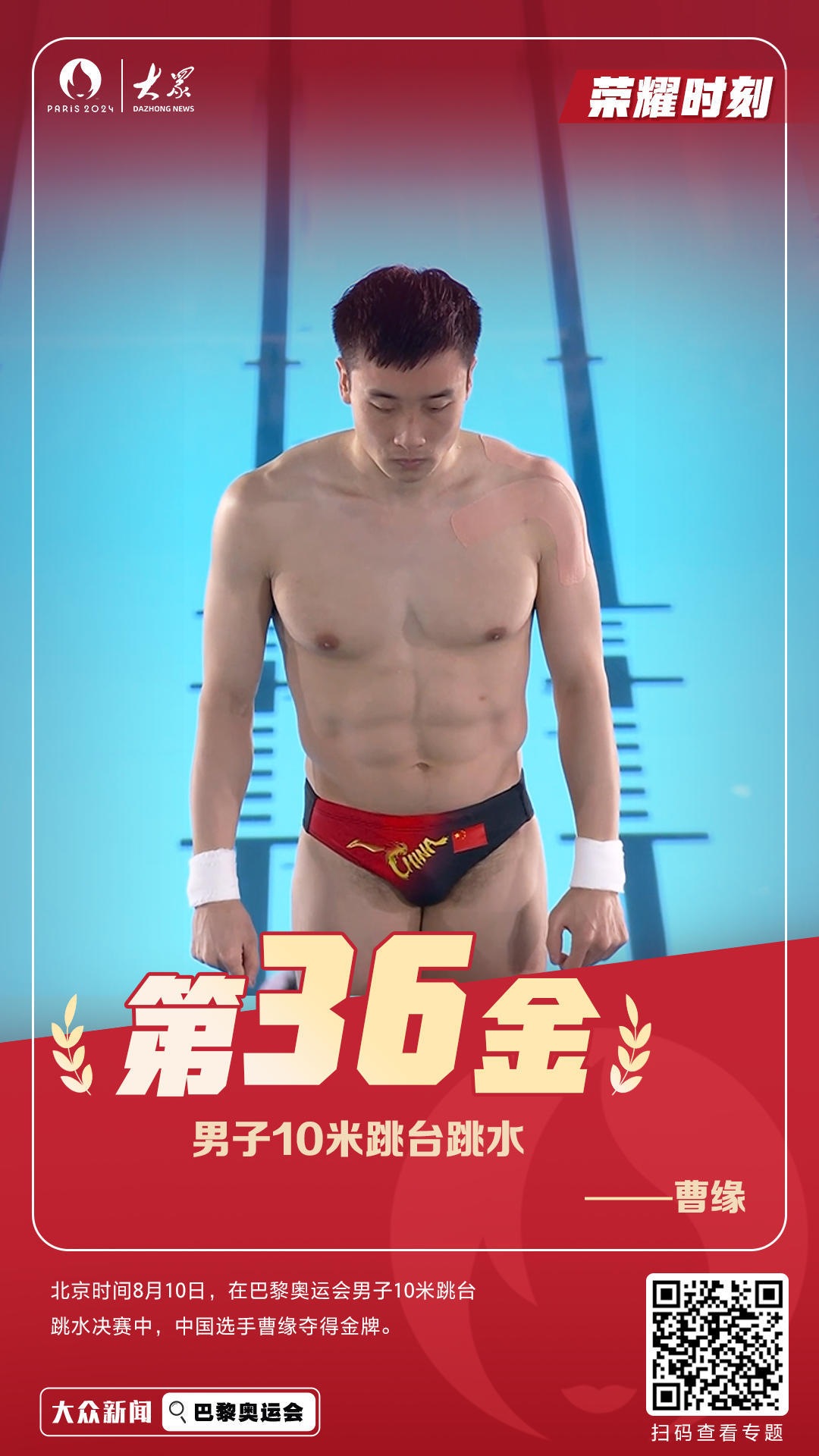 北京时间8月10日,在巴黎奥运会男子10米跳台跳水决赛中,中国选手曹缘夺得金牌。这是中国代表团在本届奥运会获得的第36枚金牌。