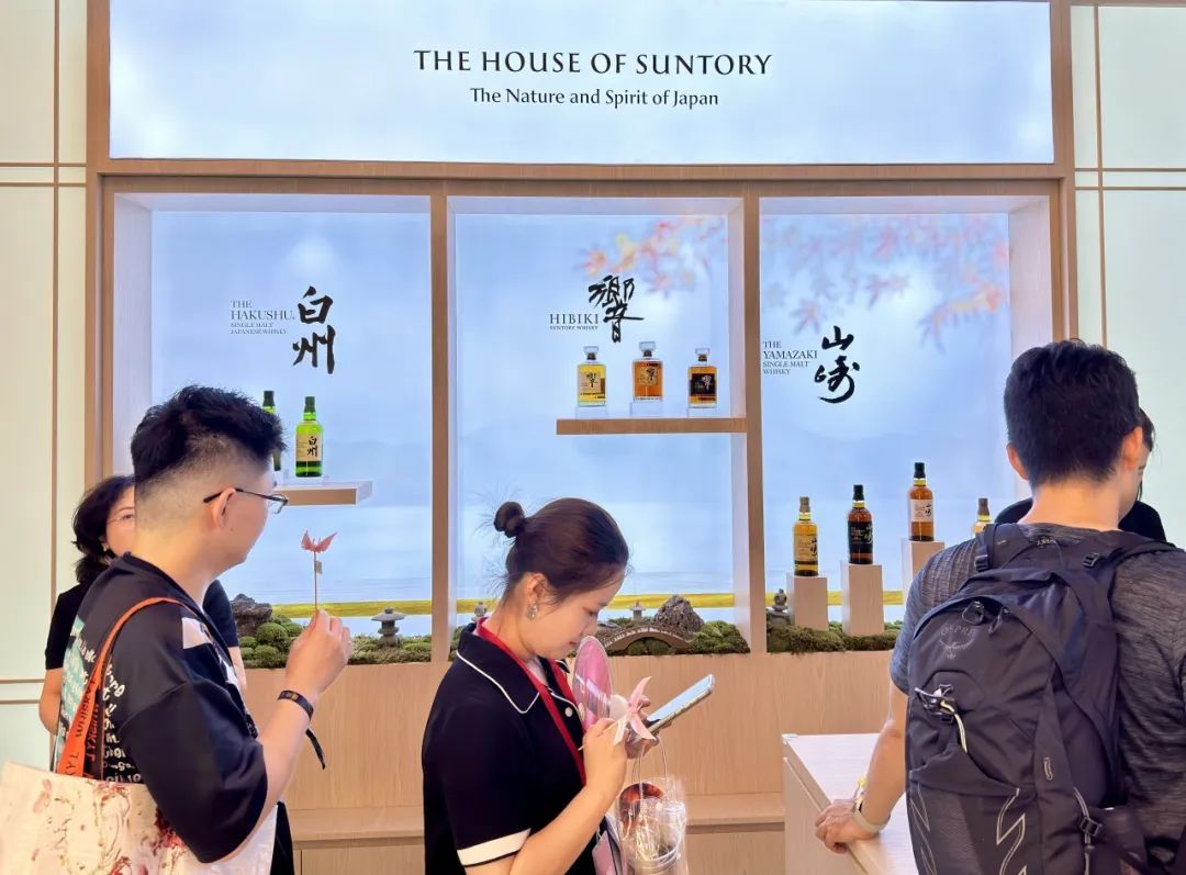 比如位于二馆的三得利全球烈酒展台上,宾三得利旗下苏威和日威品牌悉数登场,包括波摩、山崎、白州、响、知多、Ao碧、Haku白和欧肯特轩。展台空间的独特设计,带给观众一场身临其境的“宾三得利环球奇幻之旅”。