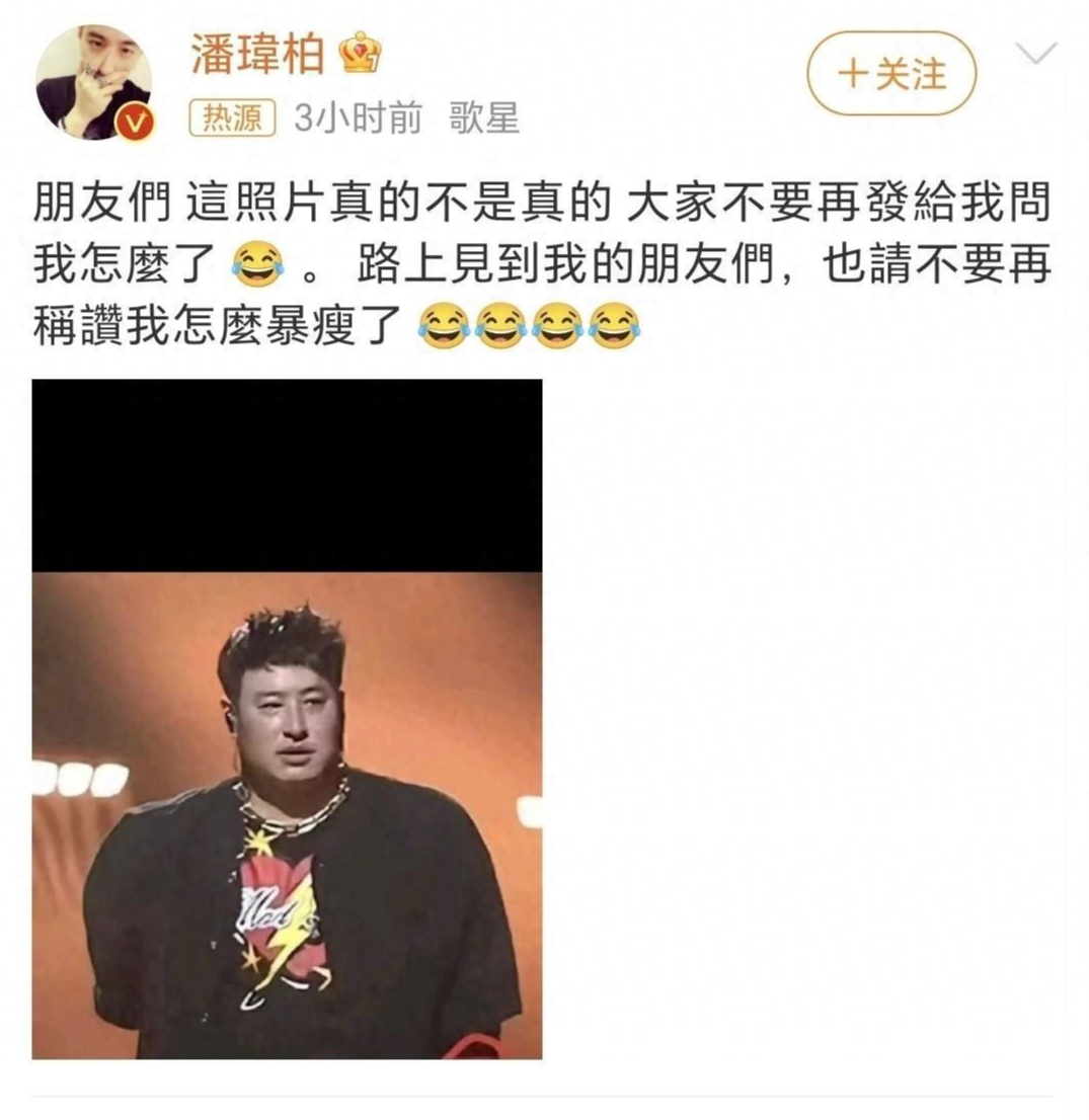 近日,一张歌星潘玮柏的发福照在网络疯传,图片中的潘玮柏目测有200多斤。潘玮柏8月11日发文澄清:照片不是真的。