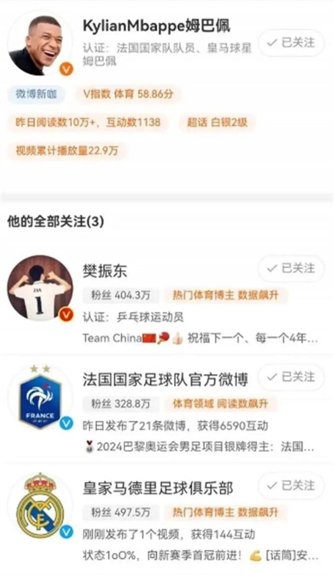 8月10日,姆巴佩的微博账号对樊振东进行了关注,这是姆巴佩在微博上关注的第3个账号。
