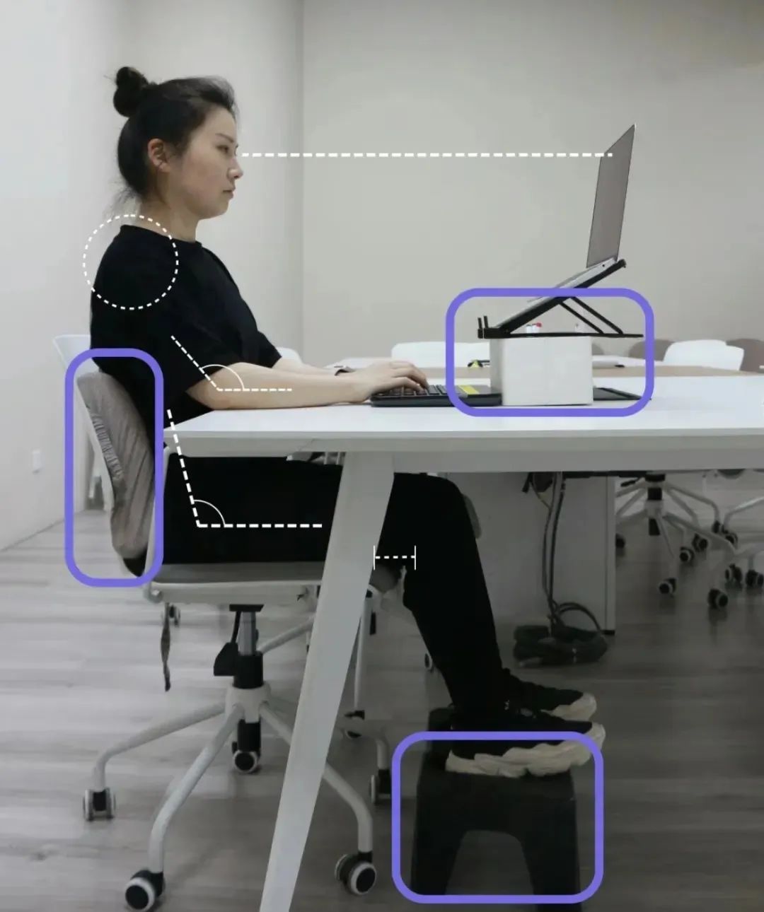 把桌子调整到脖子最舒服的高度,椅子可以让双脚平放地面,再把电脑调到视线持平,最后确定自己打字时,手臂在桌面上能得到足够的支撑。