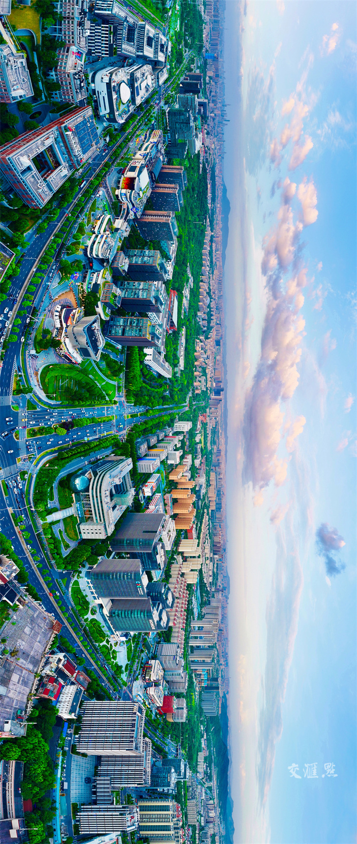 画面清晰、构图恢弘、信息量大,地标性建筑显著,表现出城市特色,表现出城市山水融合、传统与现代融合的特点,展示生态建设成就。