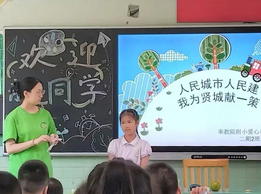 班主任老师首先介绍了奉贤新城正在征集城市建设好点子的情况,明确了课堂主题,随后播放贤城短视频,展示产业发展的创新案例,令孩子们对新城的发展蓝图有了更直观的了解,让同学们找到思考方向,开动小脑筋思考属于自己的新点子,为贤城的发展注入新活力。