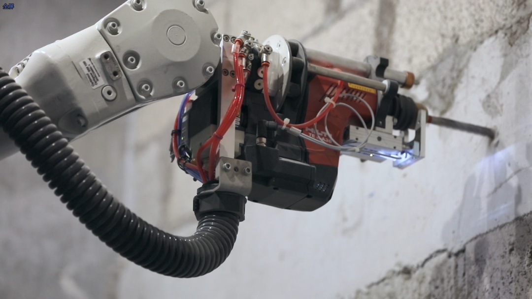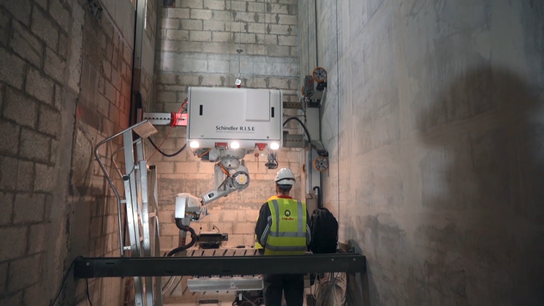 “突!突!突……”在电梯塔楼的井道内,不见人影,但钻孔、安装的声音不绝于耳,原来是迅达电梯的机器人电梯安装系统Schindler R.I.S.E正在井道内忙碌。只见机器人挥舞着机械手臂,给每一个导轨支架和层门钻孔,并安装好一颗颗膨胀螺栓。不一会儿,一整层电梯的螺栓便安装完成。