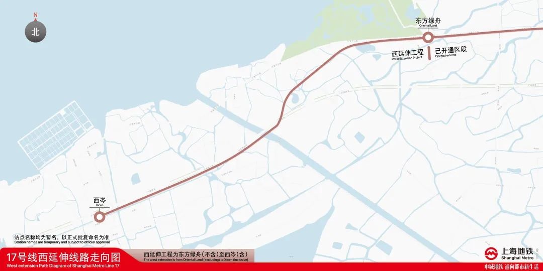 17号线西延伸工程由既有东方绿舟站向西延伸至西岑站,全长约6.6公里,共设一站一区间,全线为高架区间。该项目2021年6月开工,预计今年年底开通运行。通车后,将大幅提升示范区先行启动区交通可达性和便利性,方便青浦西岑、练塘、金泽等地居民的出行,为华为研发中心、西岑科创中心提供极大的交通便利,进一步优化示范区快速交通网络。
