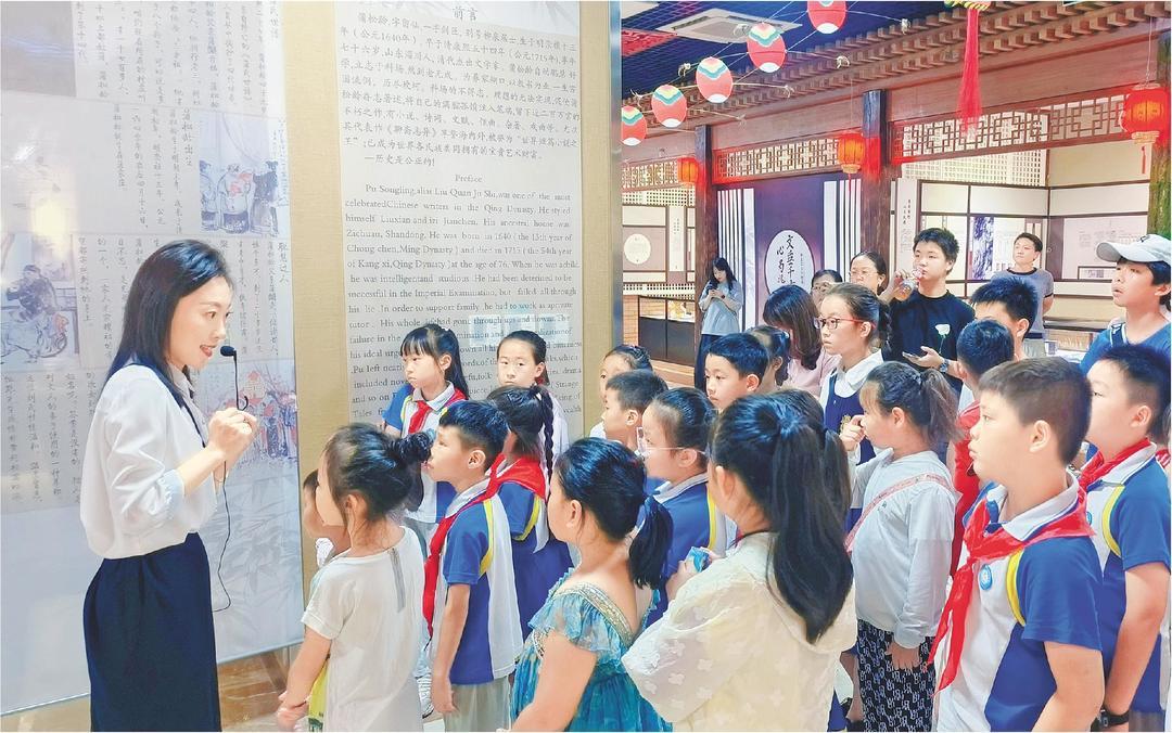 8月7日,由山东省文化馆、淄博市文化和旅游局、淄川区人民政府主办的“齐遇·梦幻聊斋”非遗主题文化展在山东省文化馆开展。展览全方位、多角度地展现了蒲松龄充满传奇色彩的一生,以及后人在传承保护“聊斋”这一艺术主题中取得的丰硕成果。图为讲解员为参观的学生们讲解聊斋文化。