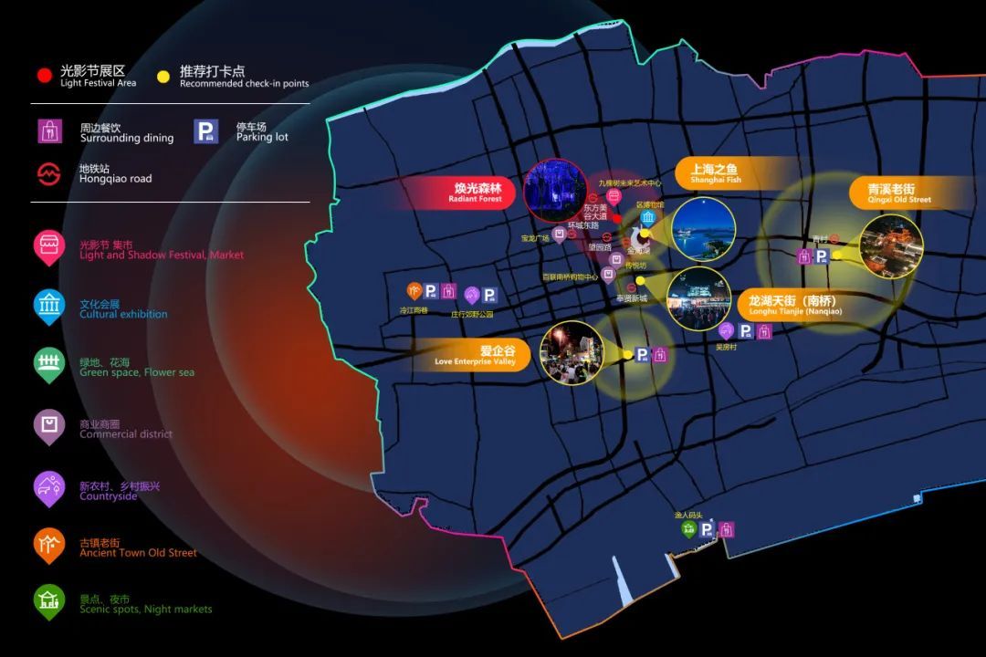 首届上海国际光影节奉贤区分会场采用“奇幻森林”为主视觉意象,向市民开放光影打卡点和推荐打卡点,涵盖吃、住、行、游、娱、购及特色夜游,将文化、艺术、运动、生态、低碳科技相结合,为市民呈现丰富的日、夜间生活场景及沉浸式体验,打造多元共生、跨界共赢、群众喜爱的奉贤特色光影秀,展现奉贤的独特魅力。
