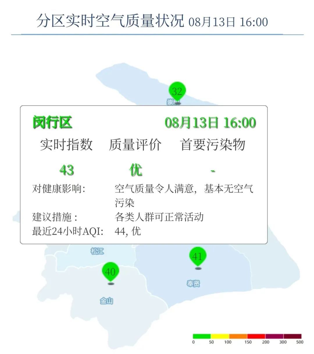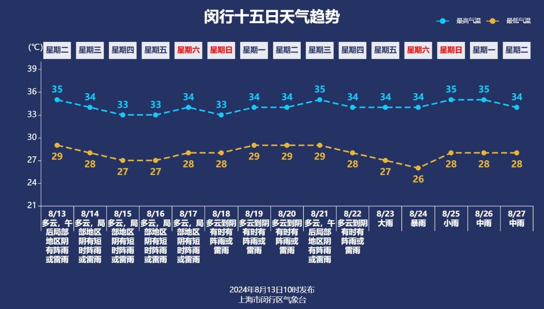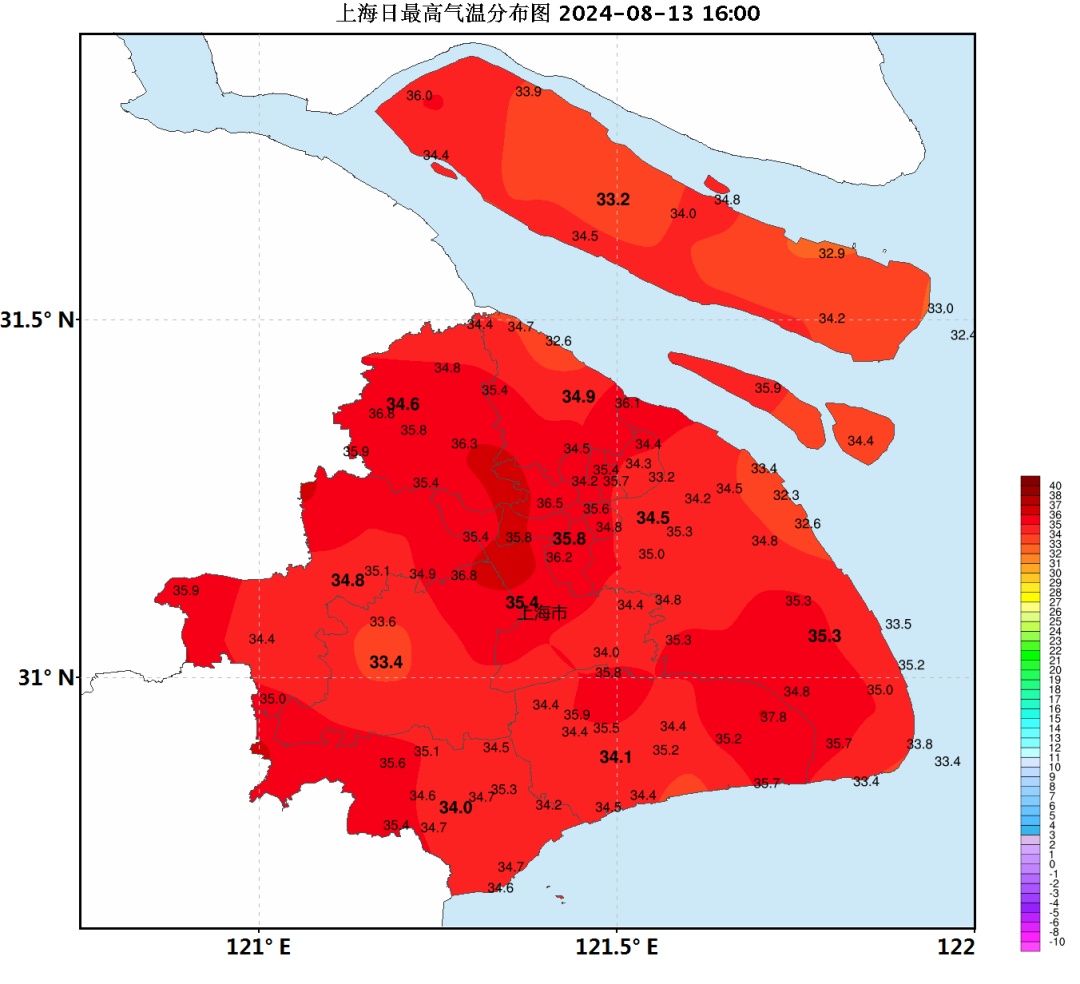 今天又是一个高温日,最高气温达到高温线的站点是市区徐家汇站(35.8℃)和闵行站(35.4℃),其他站点普遍是在33—34℃附近。由于空气湿度大,体感闷热不舒适。