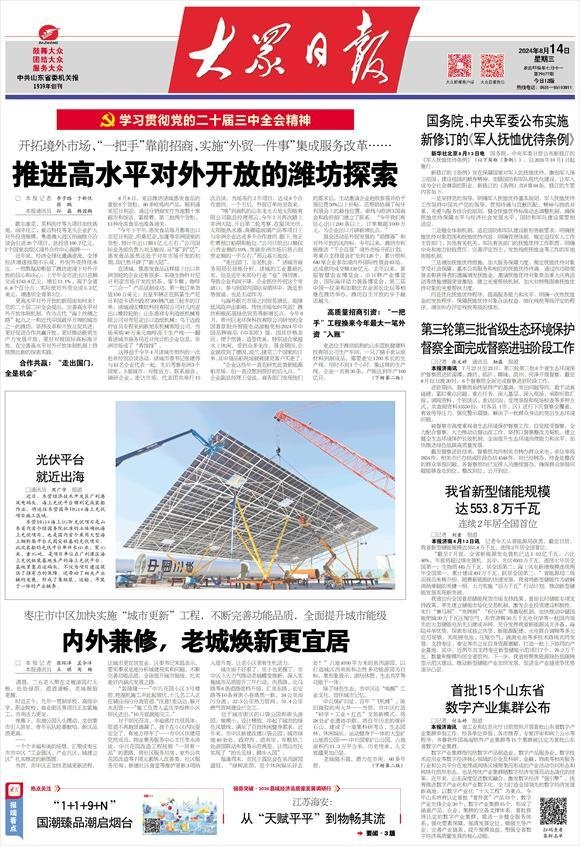 8月14日出版的大众日报在一版到头条位置刊发新闻,介绍了枣庄市市中区实施“城市更新”让老城焕新宜居的经验做法,全文如下: