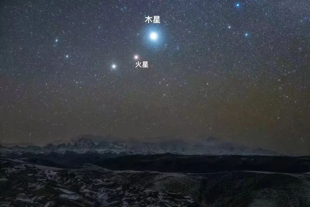 两颗行星相距这么近,如何分辨?杨婧建议,一是从亮度上看,火星0.9等左右,木星-2.2等左右,木星明显比火星要亮。二是从方位上分辨,火星位于木星的左上方。