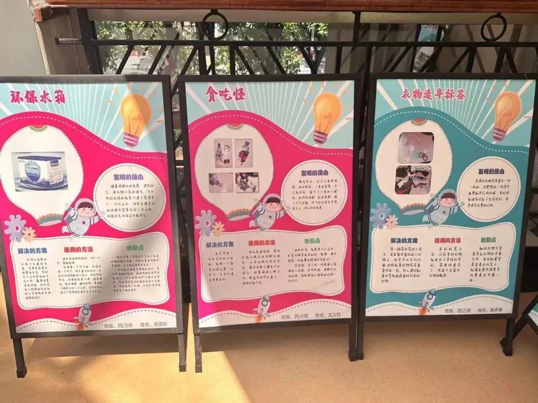 在科技节的氛围中,学生们利用废旧材料,构建城市平面图和城市建筑、制作富有创意的动力小车;观察城市中存在的问题,尝试提出解决方案,形成调查报告,思考如何利用科技创新解决现实问题。校园走廊里,满是孩子们的奇思妙想:自动浇花器、干湿垃圾分离器、智能盲人拐杖、水杯防漏装置……其中不少创意已经转化成了课题和发明成果。